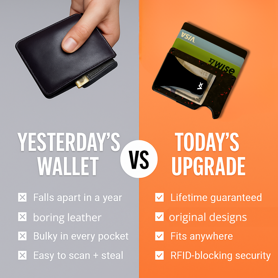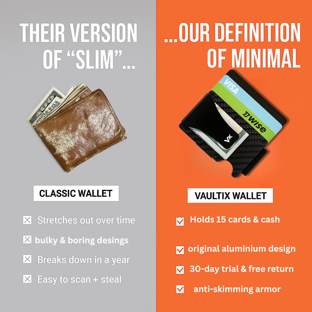Why should I switch to Vaultix™?Traditional wallets are bulky and outdated. Vaultix™ offers a sleek, compact design with built-in RFID-blocking to protect your cards from wireless theft. Plus, our quick-access button lets you fan out your cards in seconds.